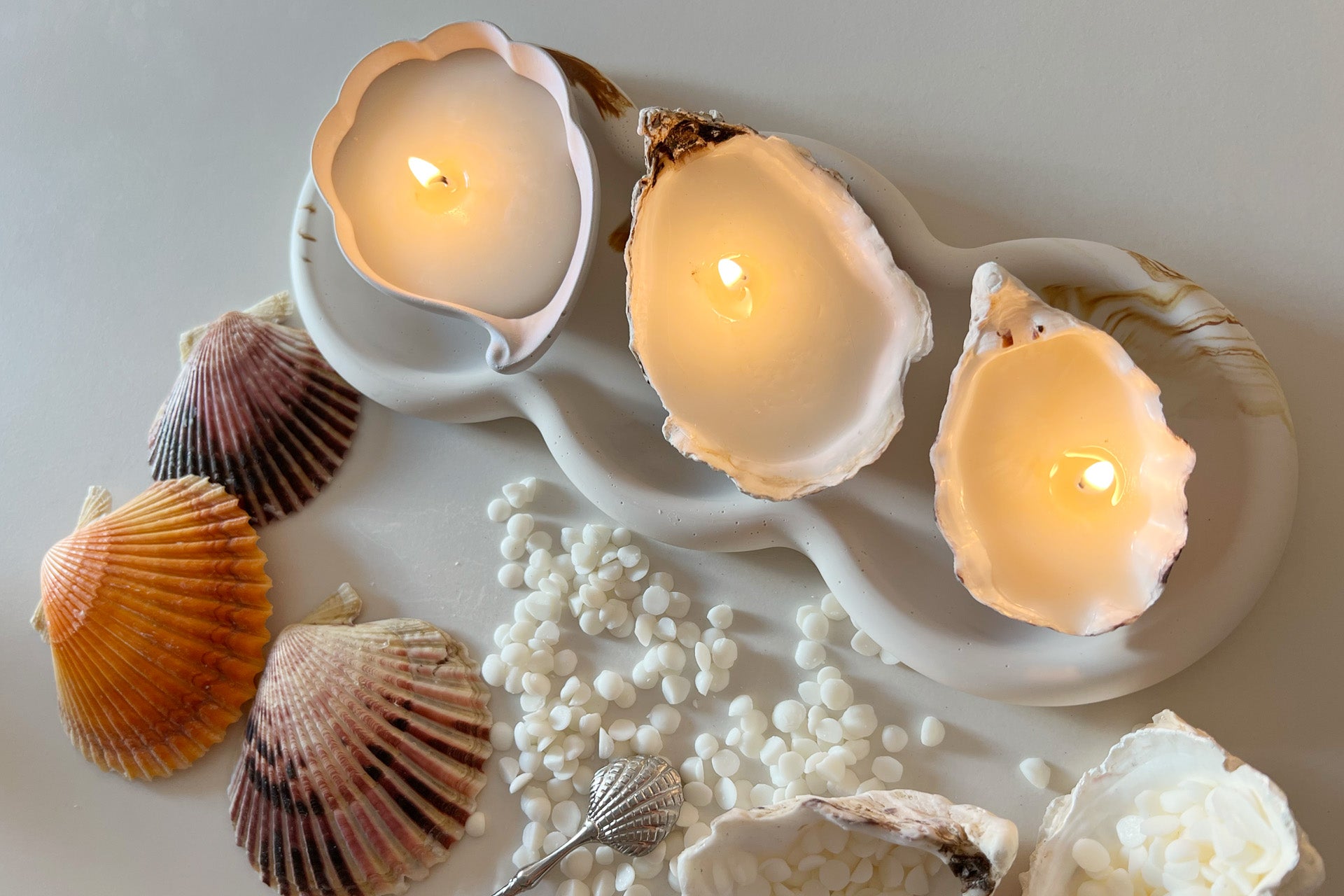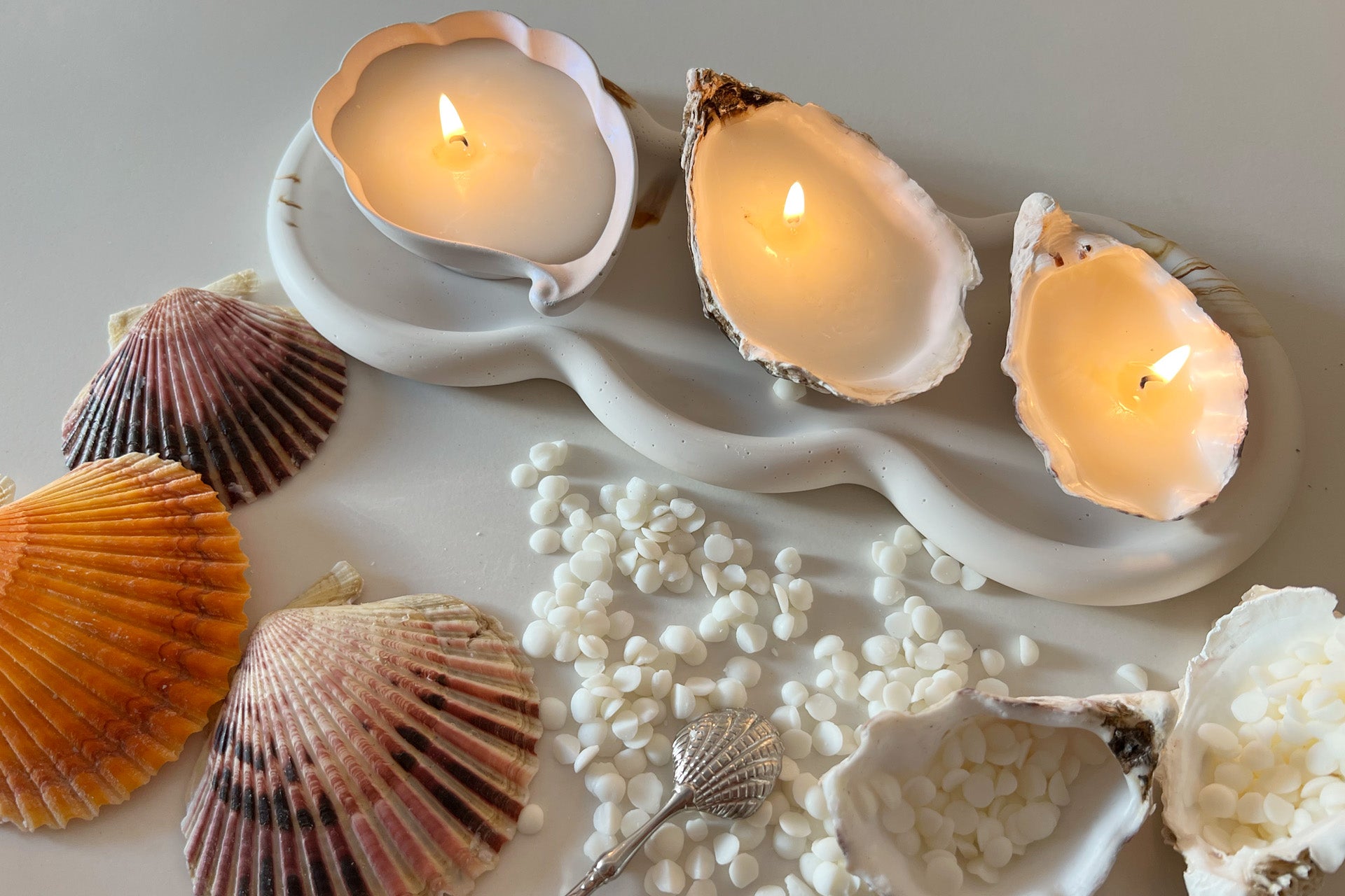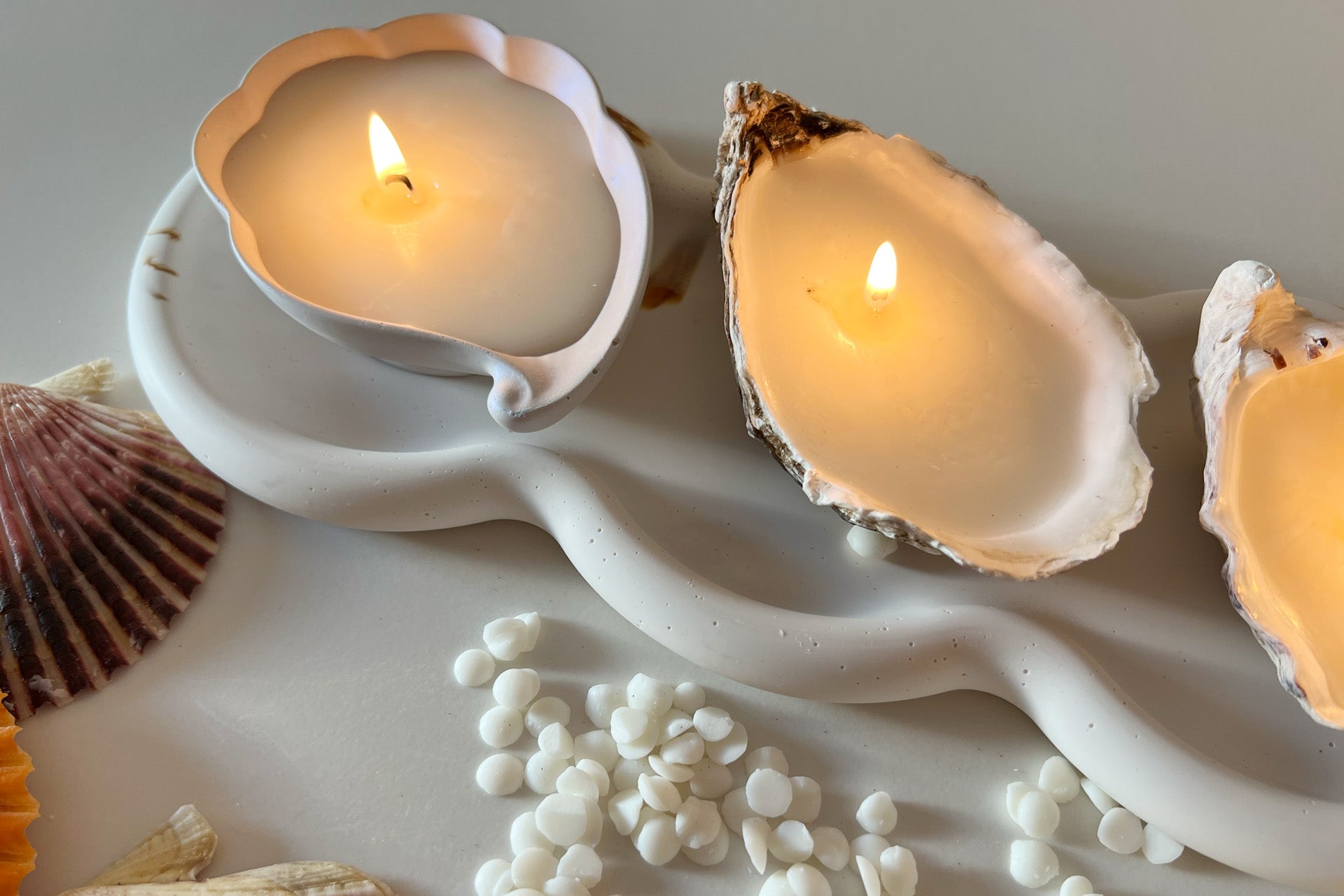 Nach dem ersten Workshop geht es weiter mit dem Kerzen Gießen! Du wirst lernen, wie man hochwertige, duftende Kerzen selbst herstellt. Wähle deine Düfte und Formen (das Jesin Objekt, Austernschalen oder beides), um deine eigene Kerze zu kreieren – perfekt als Dekoration oder Geschenk!
